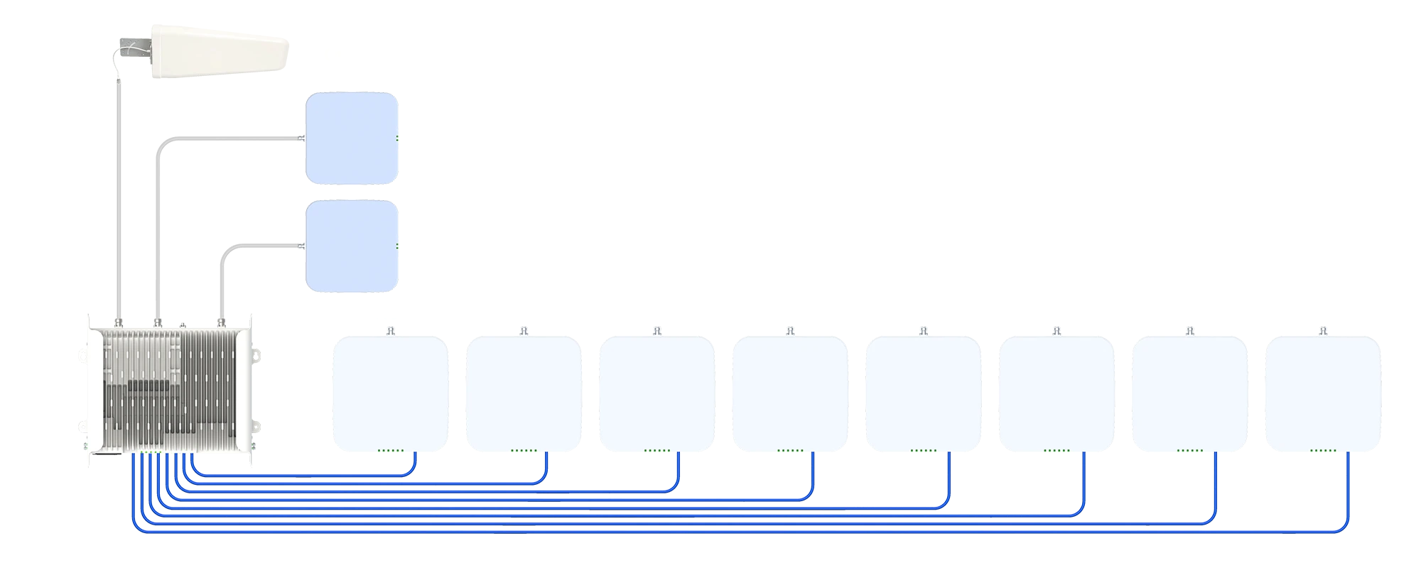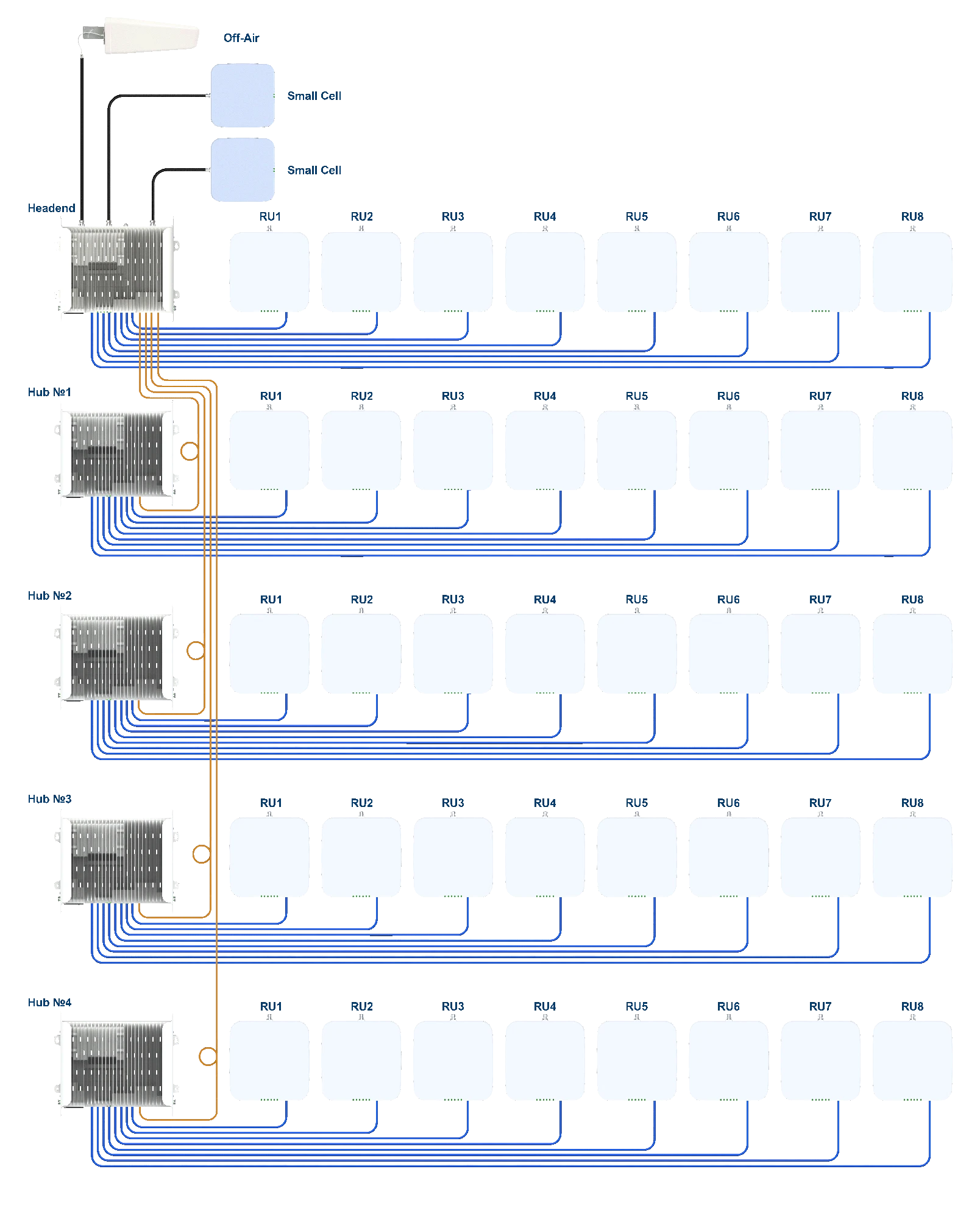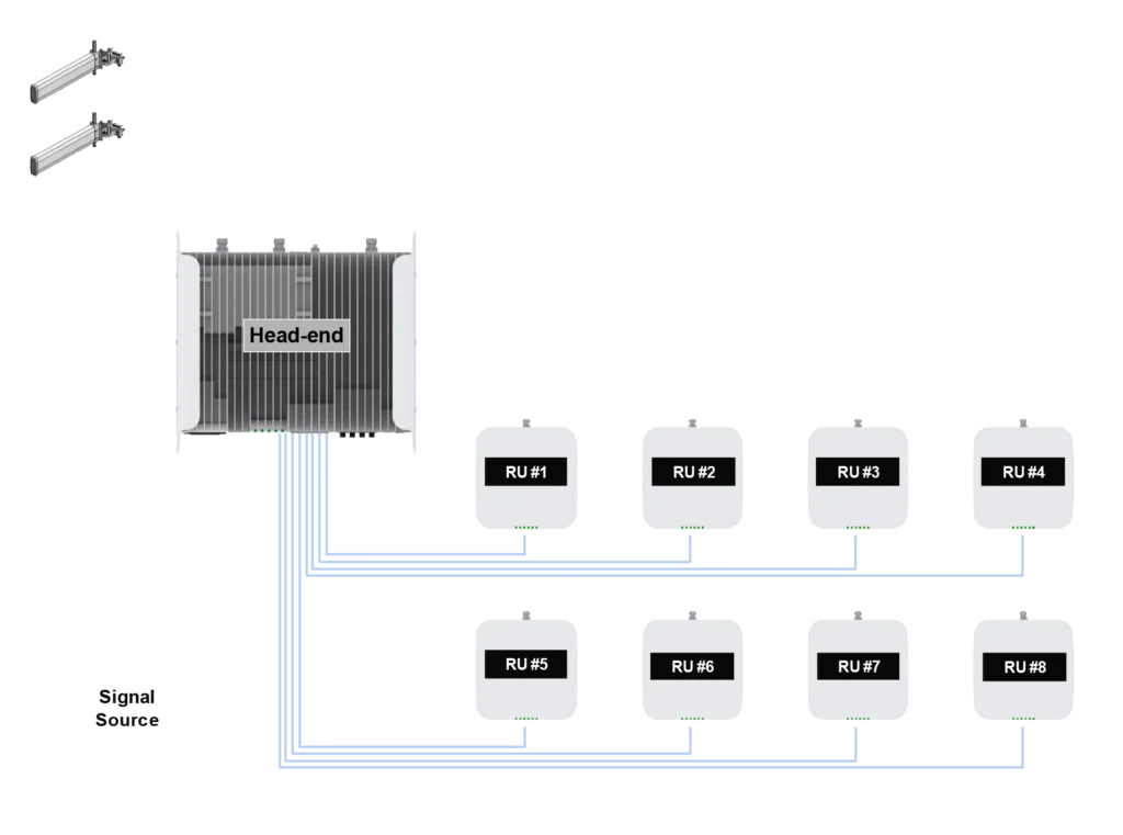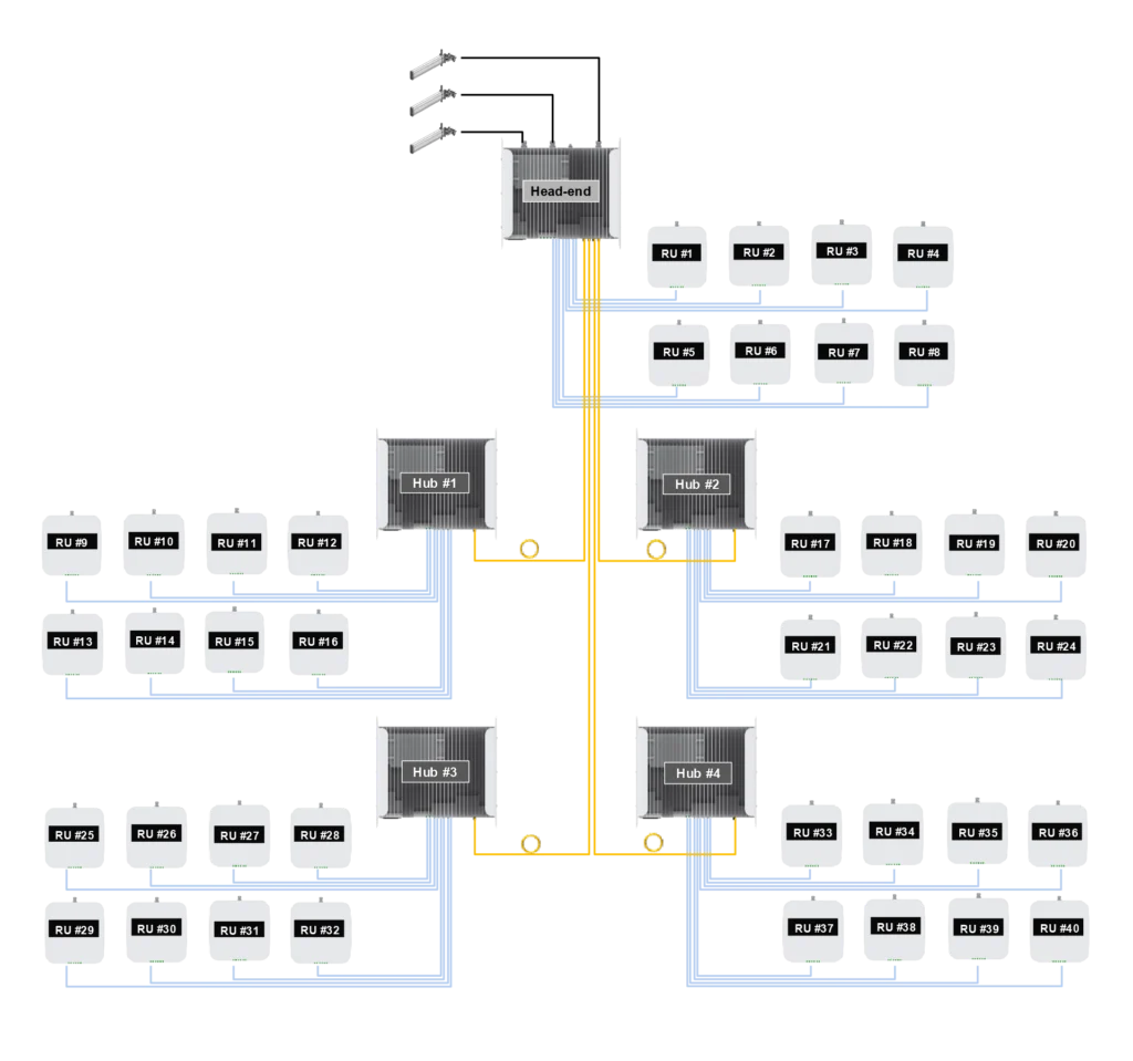 Each headend and HUB supports eight (8) remote units each. Utilizing up to four (4) HUBs, the system scales up to 40 RUs through a single headend, reducing the need for additional, costly headend and donor equipment for a low total cost of ownership.